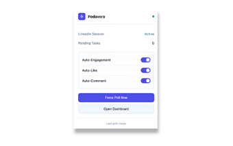 Belangrijke functies van Podavera zijn onder andere automatische reacties en AI-gegenereerde opmerkingen die relevant en doordacht zijn. Daarnaast biedt het een slim planningssysteem dat de betrokkenheid verspreidt over de dag met realistische timing. Met een gebruiksvriendelijk dashboard kun je je taken en statistieken bijhouden, terwijl ingebouwde limieten ervoor zorgen dat je account veilig blijft. De installatie is eenvoudig en vereist slechts één klik om je LinkedIn-account te verbinden.